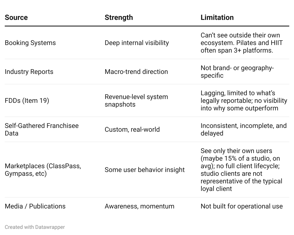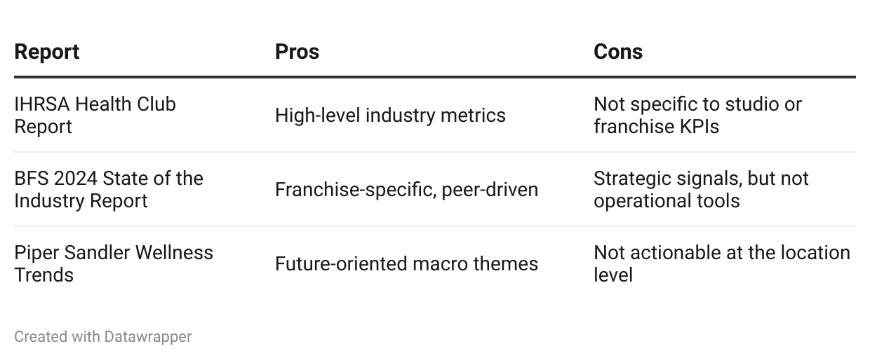 Franchise leaders are being forced to stitch together insights from tools that were never designed for strategic decision-making. Booking systems, industry reports, consumer apps, and self-reported franchisee data all offer fragments. But none give you a clear, consistent, operational view of what’s actually happening, or how much opportunity you’re leaving on the table.